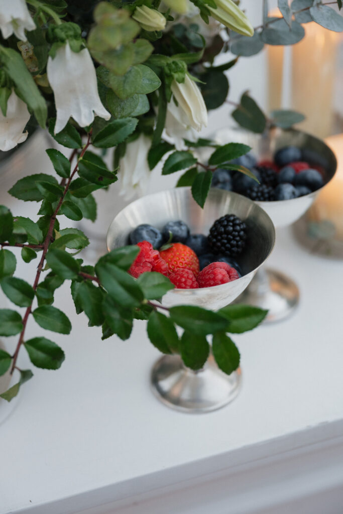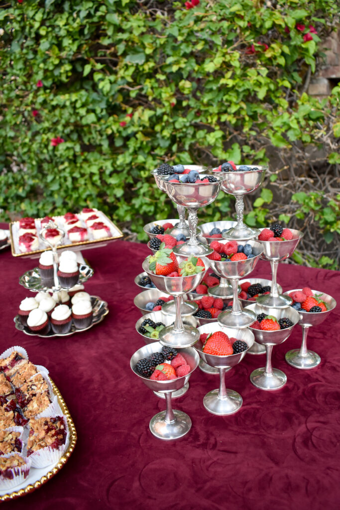 Tower of Berries: In addition to Sugar Lab Bake Shopโs treats on the dessert table, the star was the silver coup tower of fresh berries created by the Events by Fran team, a sweet twist on the trend of champagne towers. This provided a fresh, easy-to-enjoy, gluten-free option for guests, while incorporating another touch of red.