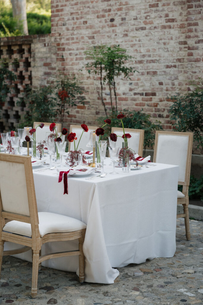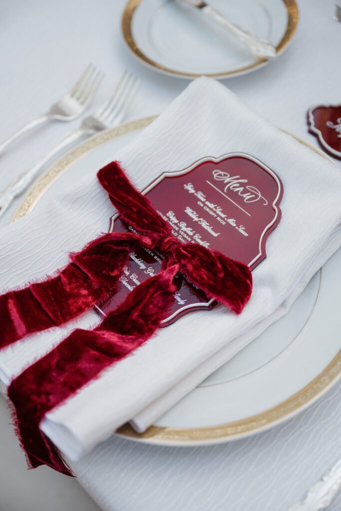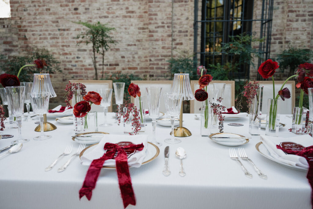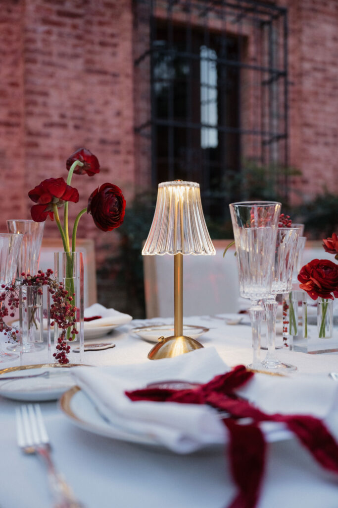 Cobblestone Courtyard Table Decor: Tying into the theme, the table settings included wireless gold table lights, gold accented plates, red velvet ribbons, acrylic menus by The Kimi Collective on each place setting, and simple elegant red florals in glass vases.