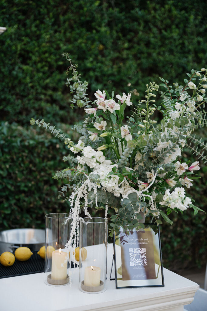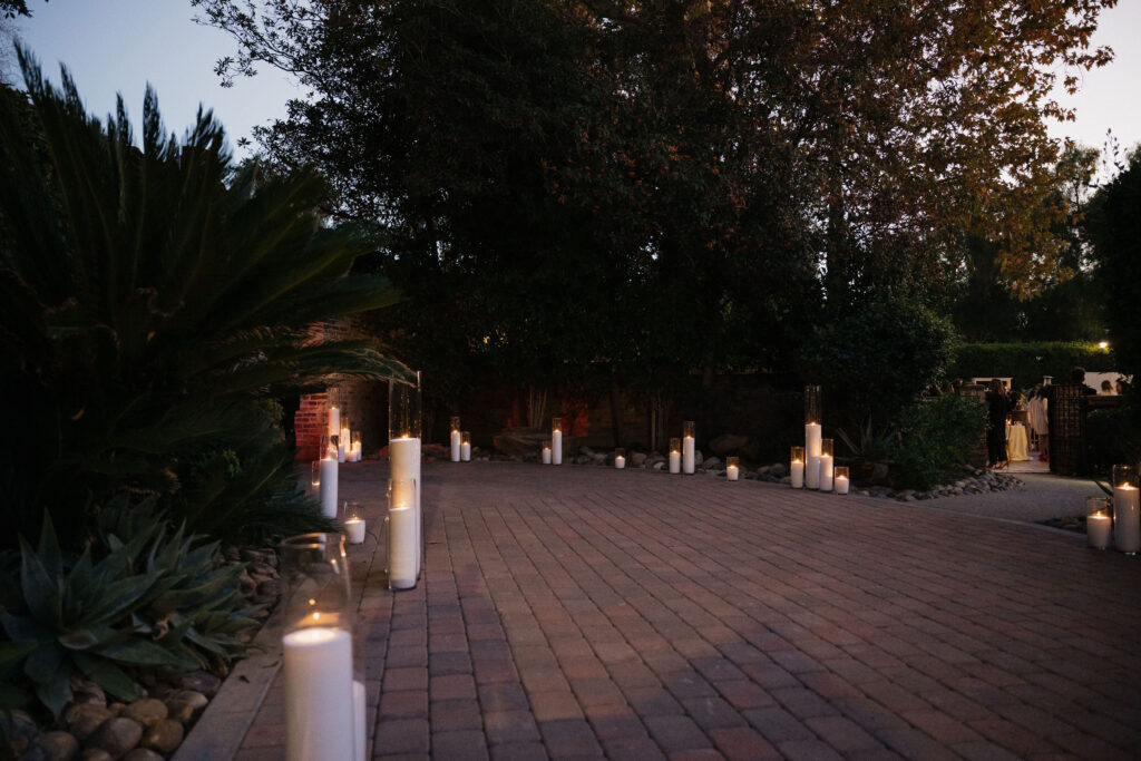 Candles: Sand and glass candles by Luxury Candles California lined the entryway and were spread out among the different areas for guests to enjoy, adding a romantic vibe to the event space. They offer both elevated electric LED candles and real flame sustainable plant-based wax candles based on the venue flame requirements.