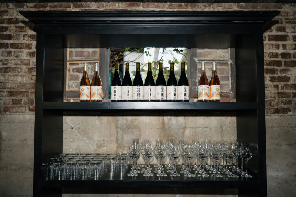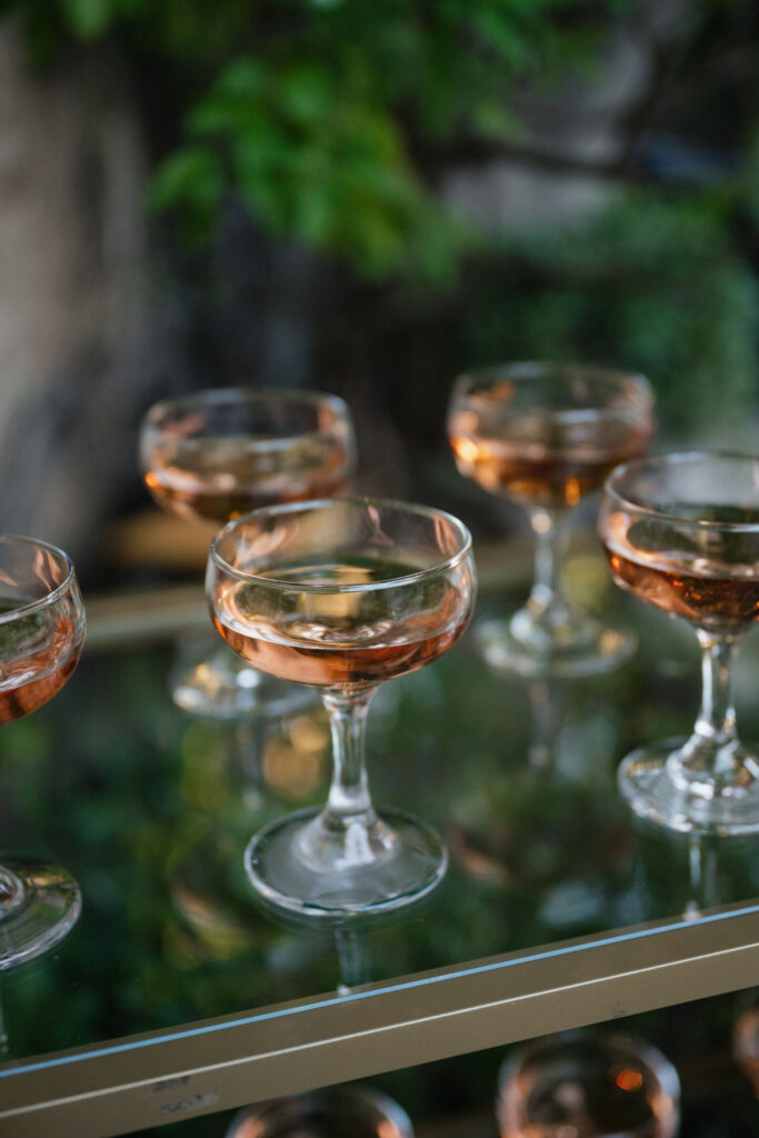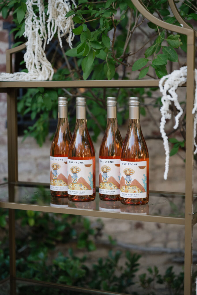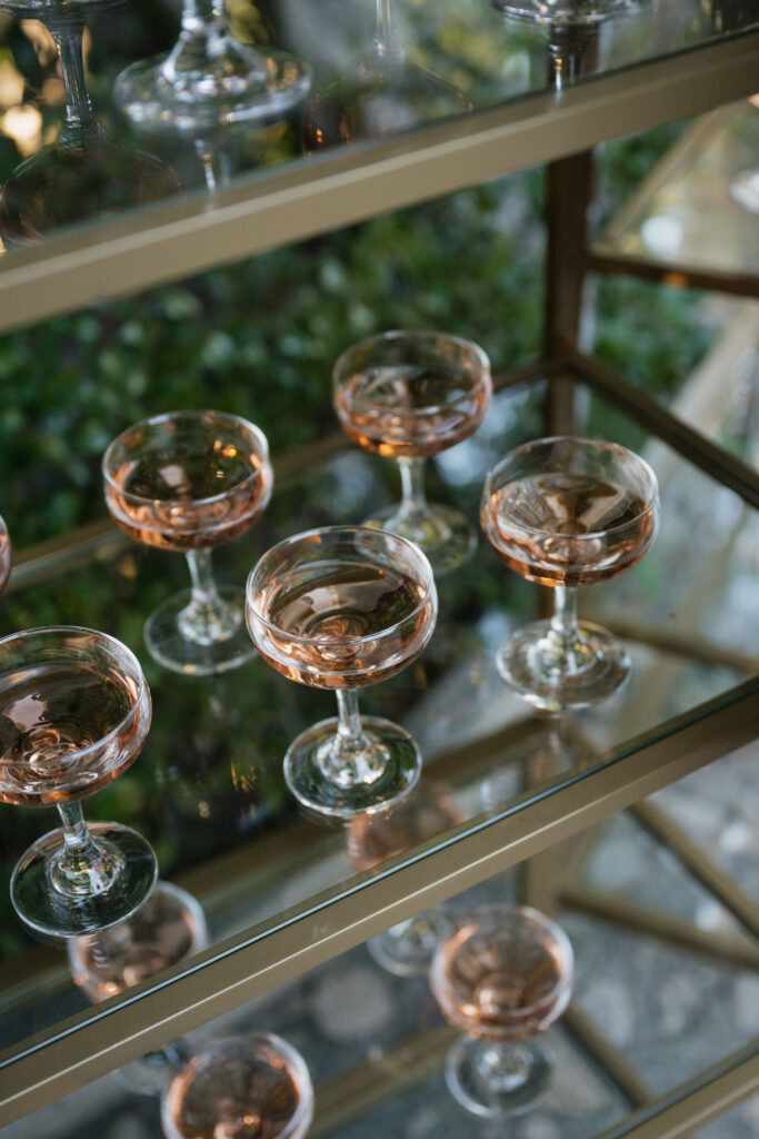 Welcome Rosรฉ: Upon entering the courtyard, guests were greeted by Made by Meg Catering servers with hand-passed Premiere Rents coup glasses filled with One Stone Cellars Rosรฉ, also displayed on golden bookshelves.