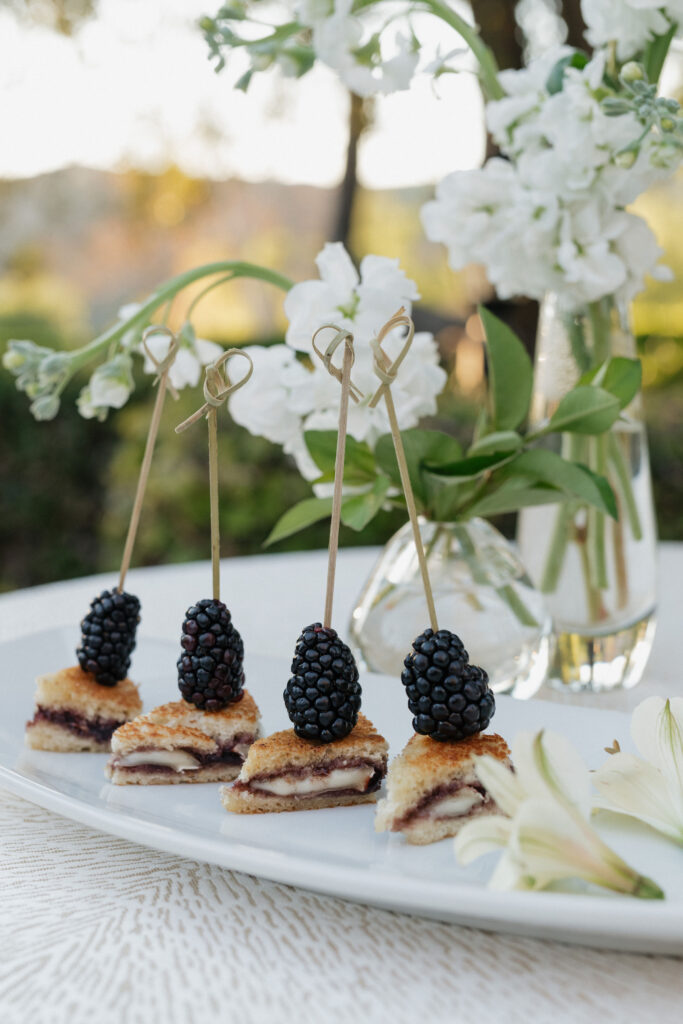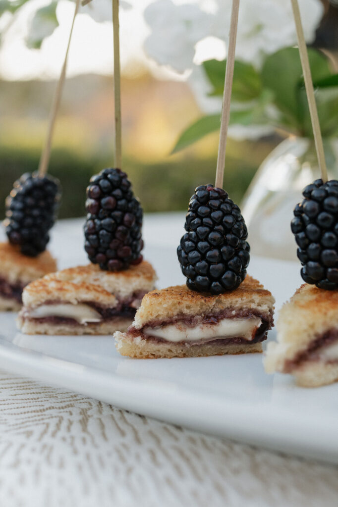 Mini sweet & savory grilled cheese sandwich on sourdough bread with brie cheese and house-made brown sugar blackberry compote, garnished with a fresh blackberry skewer.