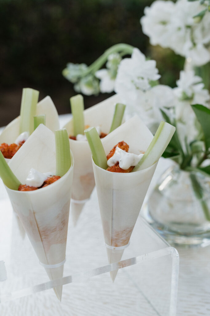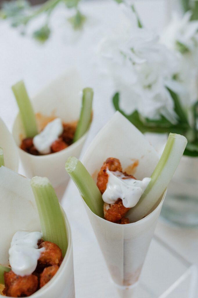 Crispy buffalo cauliflower bites with house-made vegan ranch cream cheese and buffalo sauce drizzled on top, along with celery sticks & microgreens served in bamboo cones.