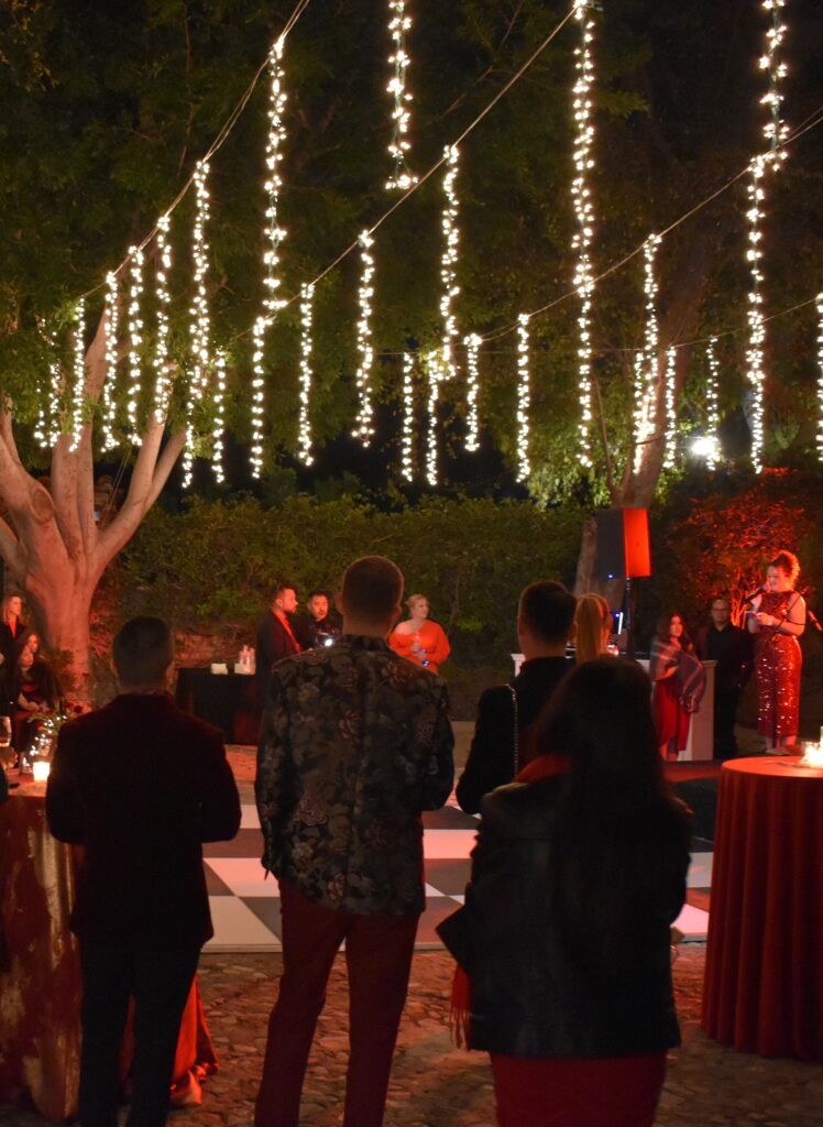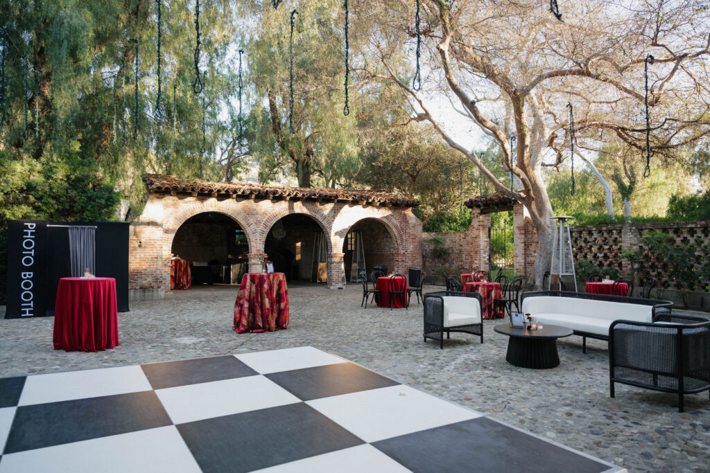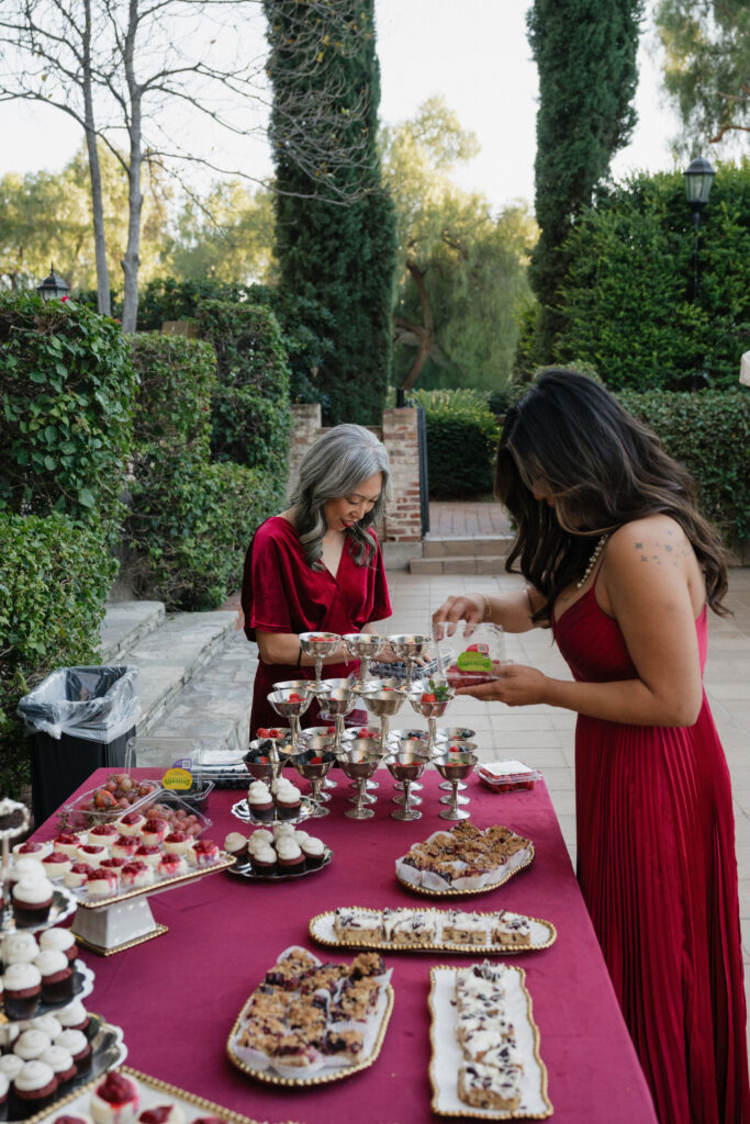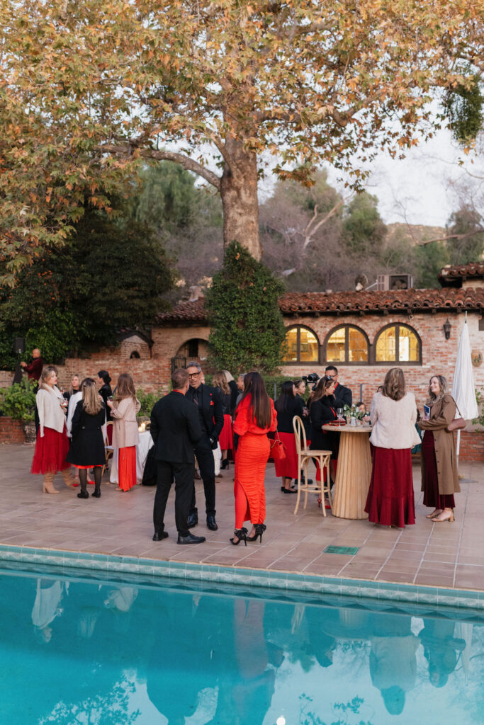 Guests embraced the chic red-hued cocktail attire dress code, while channeling Old-Hollywood glamour inspired by Selena Gomez and Benny Blancoโs much-talked-about wedding aesthetic earlier this year. The bold, romantic deep red & gold color palette paired seamlessly with the Hummingbird Nest Ranchโs European-inspired architecture and its picturesque garden courtyards in Santa Susana, CA.