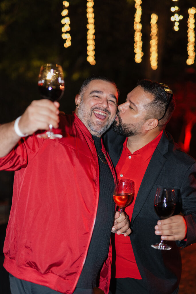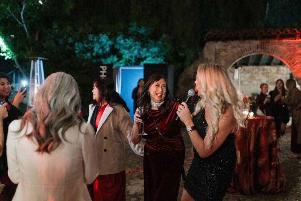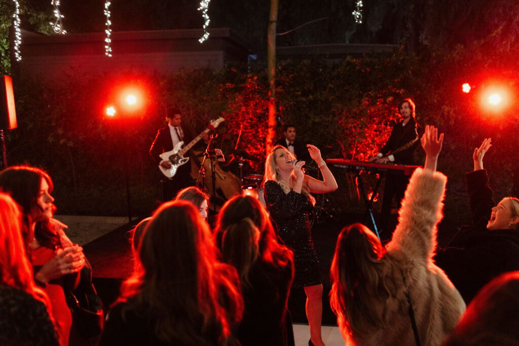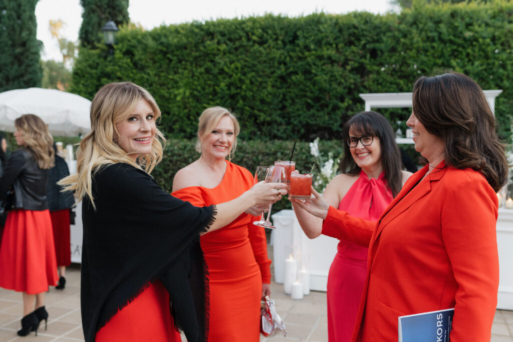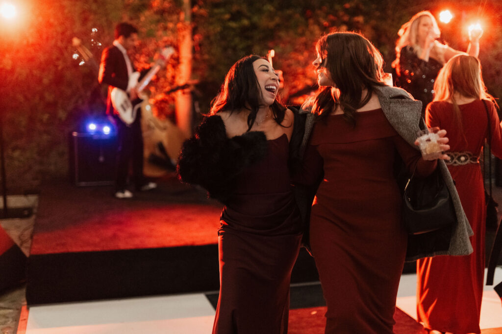 Guests embraced the chic red-hued cocktail attire dress code, while channeling Old-Hollywood glamour inspired by Selena Gomez and Benny Blancoโs much-talked-about wedding aesthetic earlier this year. The bold, romantic deep red & gold color palette paired seamlessly with the Hummingbird Nest Ranchโs European-inspired architecture and its picturesque garden courtyards in Santa Susana, CA.
