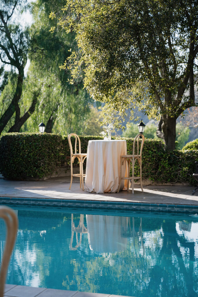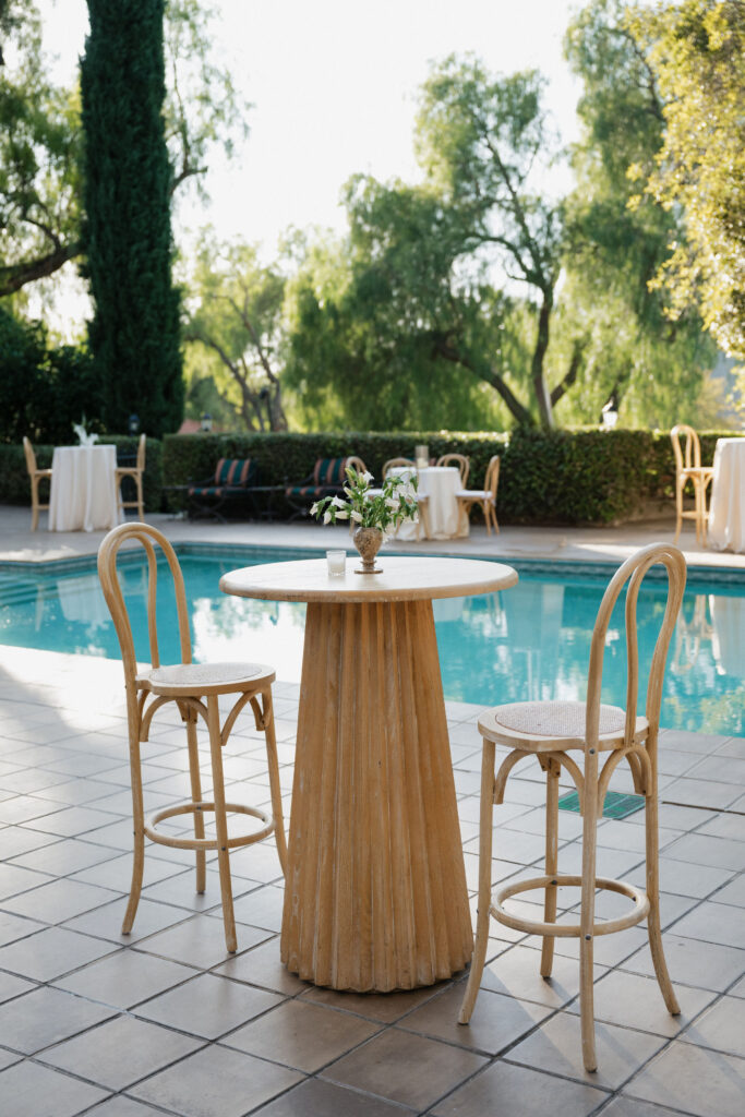 Outdoor Pool Area Decor: To ensure the venue had a different feel for golden hour, lighter florals and rentals were incorporated for the outdoor pool cocktail hour reception.