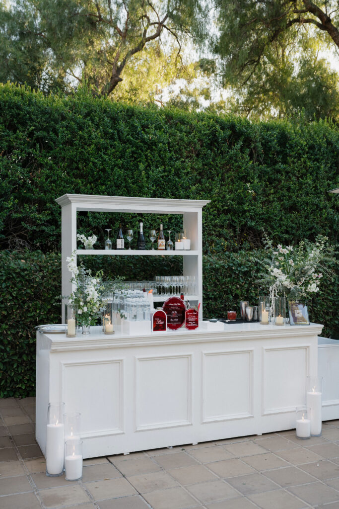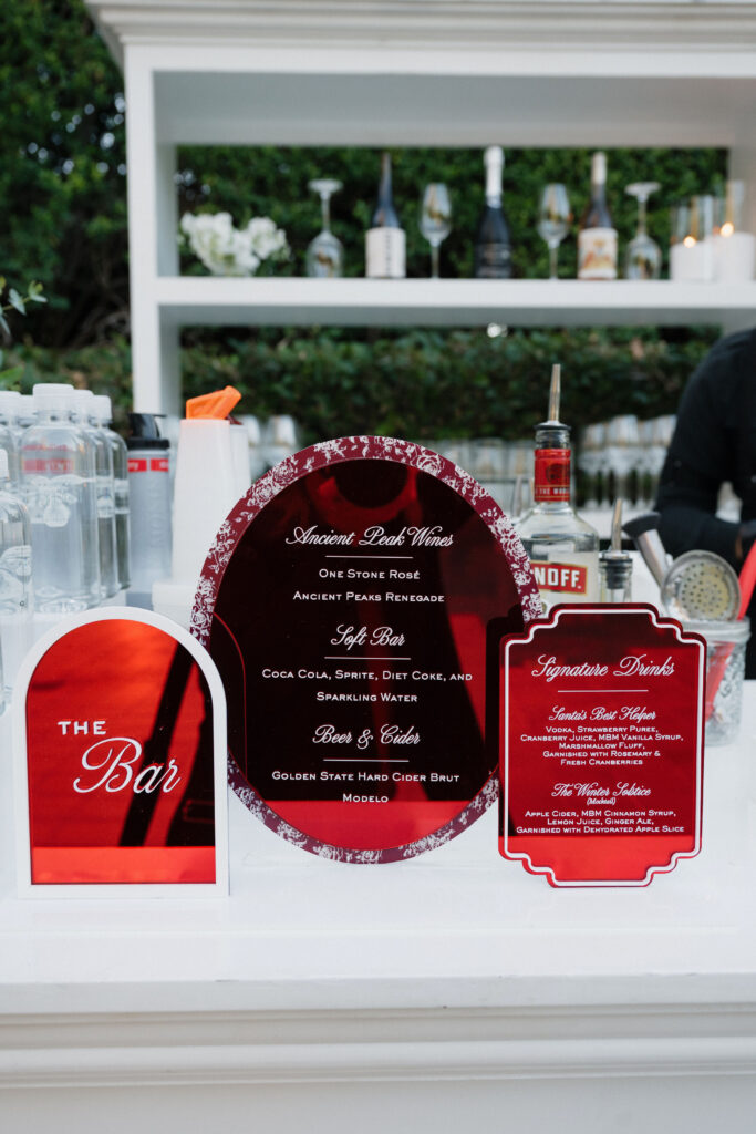 Bar Signage: Our favorite local acrylic sign creator (Kimi from The Kimi Collective in Torrance, who happens to be a phenomenal dancer) created the red themed bar menus for both of our bar areas. We love the trend of customized signage to match event themes, as this extra thoughtfulness and attention to detail adds another beautiful touch of an eventโs theme.