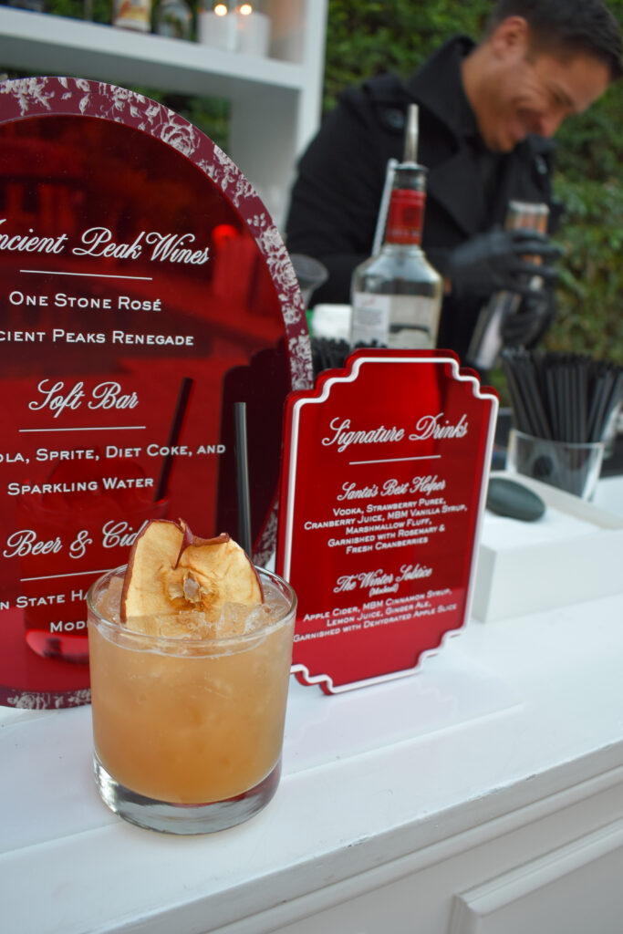 When your goal is delicious drinks to serve at outdoor events for chilly fall and winter nights, you bring in the experts. We leaned into themes that make you feel cozy with a touch of childhood nostalgia and whimsy, incorporating ingredients such as real apple cider (not to be confused with apple juice) and marshmallow. To further tie in the seasonal fall and winter colors of both red and gold, we opted for drinks that could be a statement and a piece of the color themed decor.