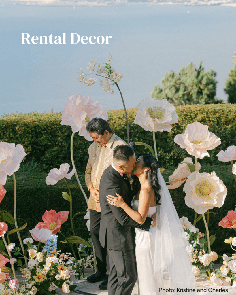 Rental Decor: โWhen deciding between venues, the more expensive option may be more cost effective if the venue itself compliments your wedding vision. Rather than pay for elements like pipe and drape to hide the venue, getting to embrace your venue reduces the need for more spend.โ – Maria of Modest Magnolia @modestmagnolia